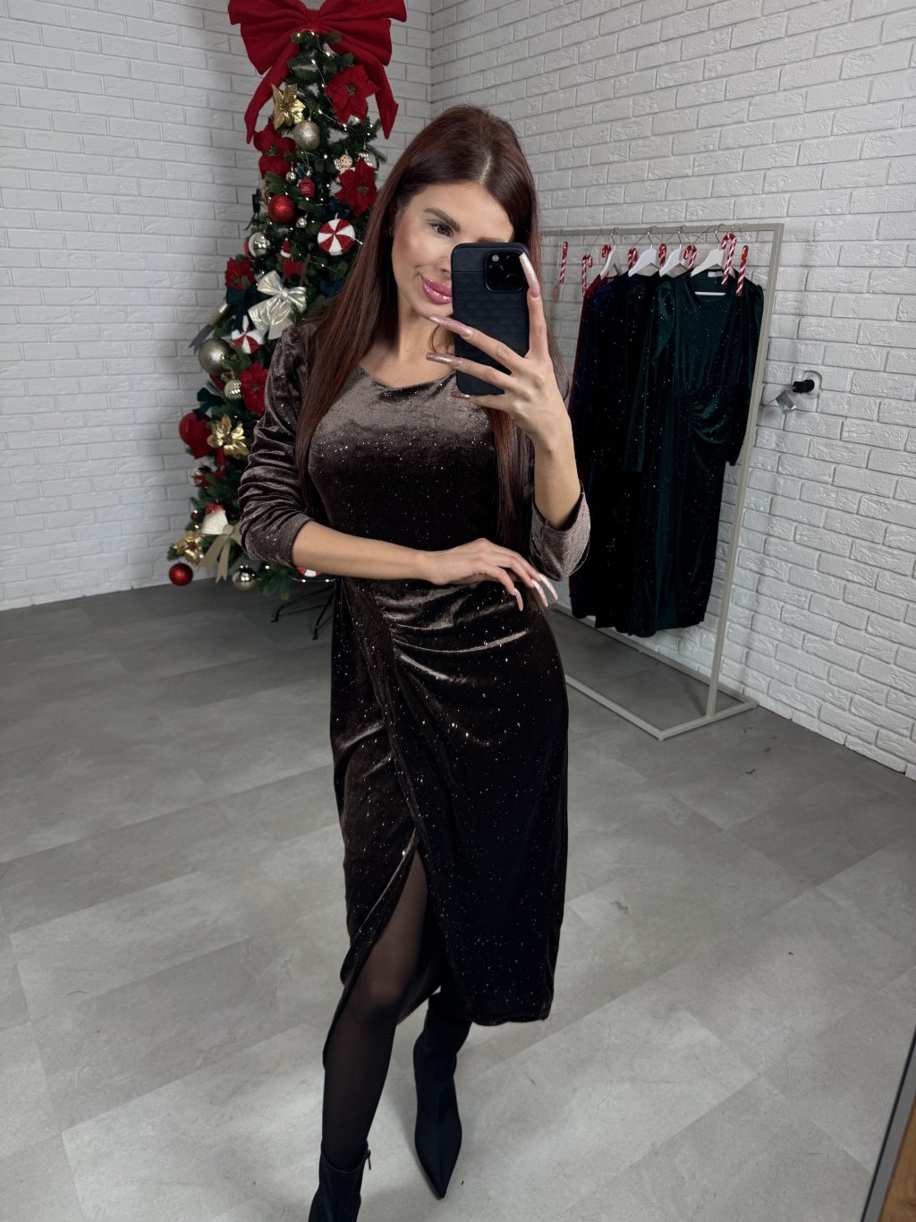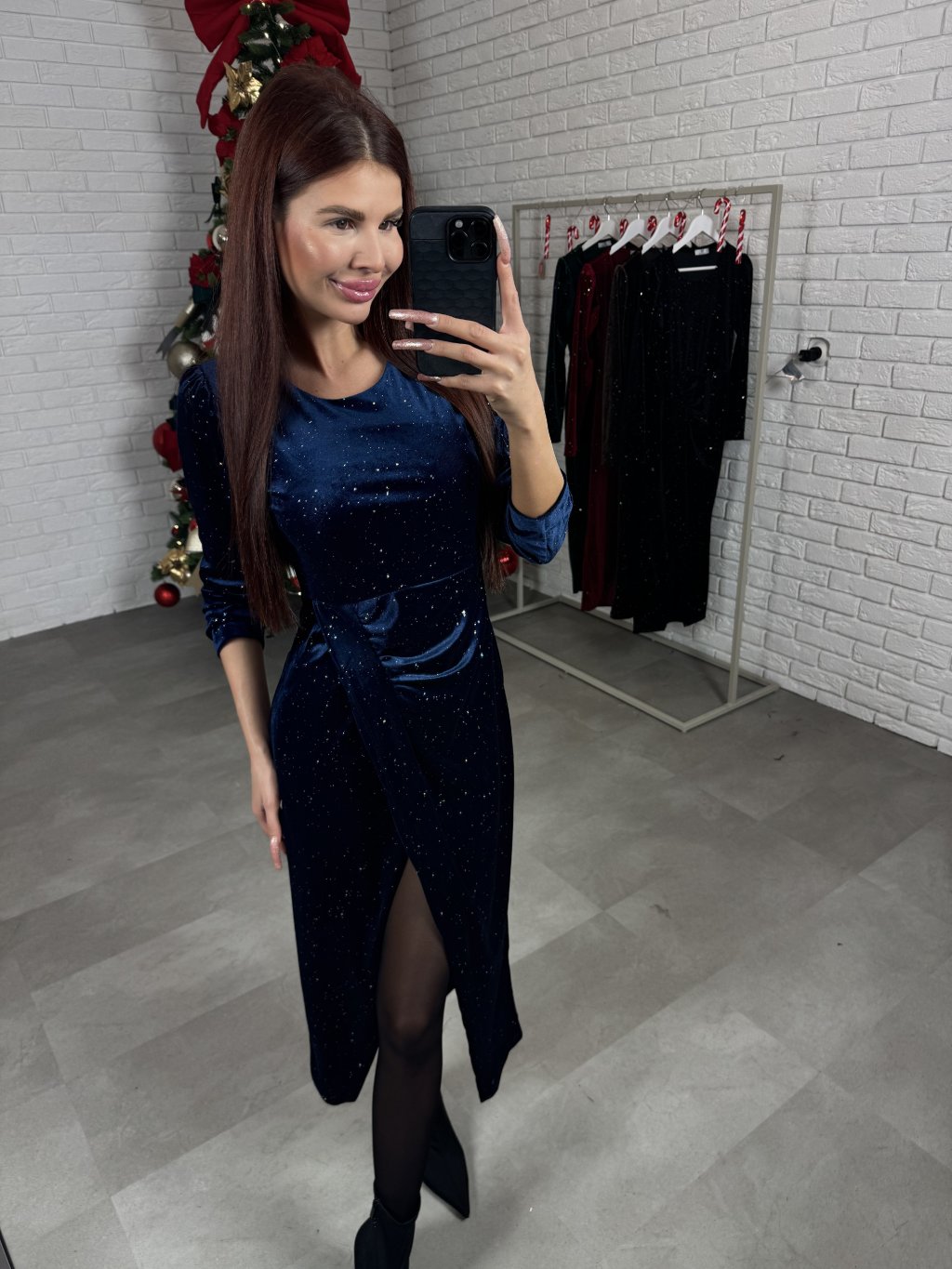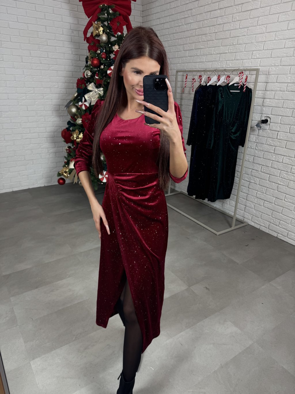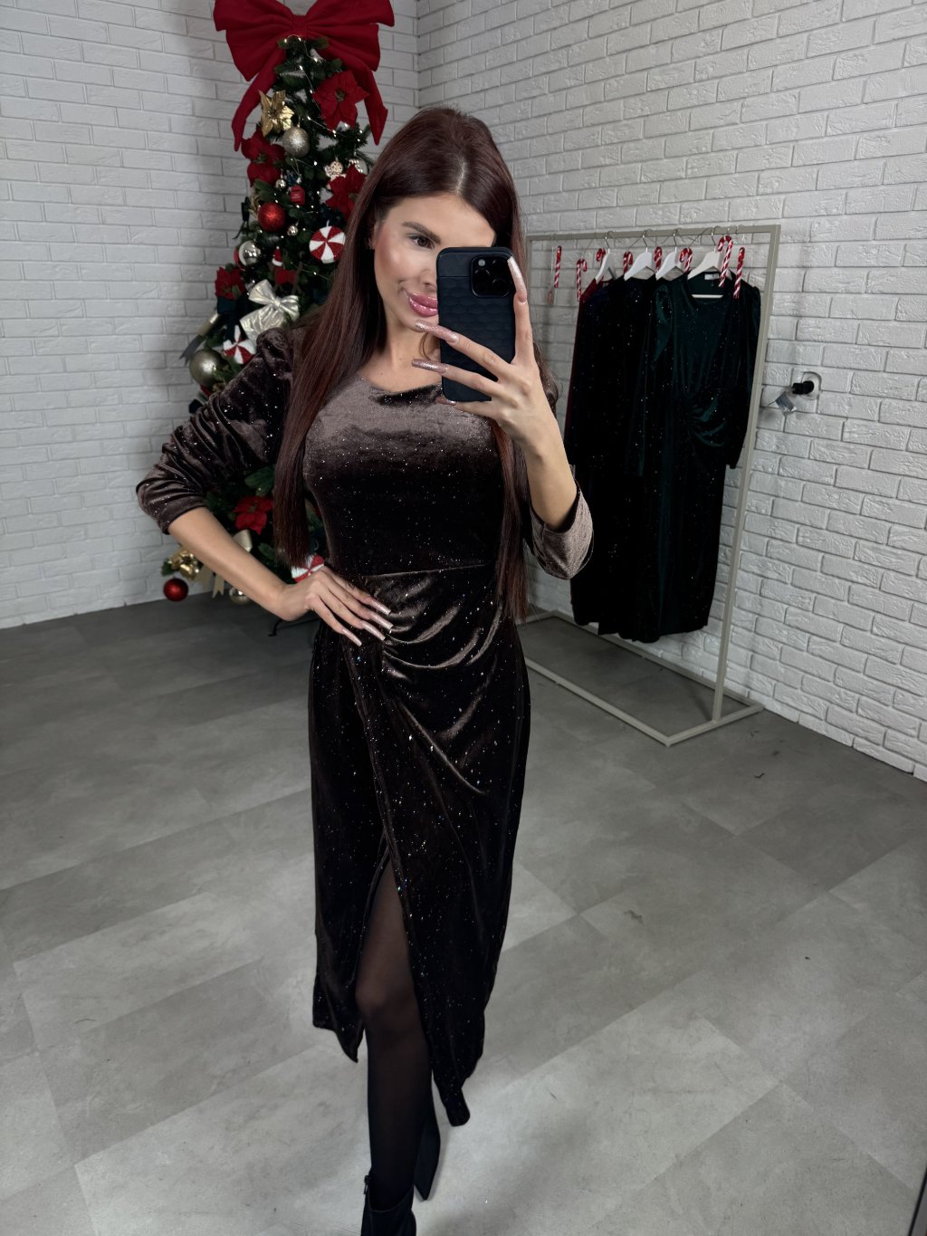 Šaty NARO zo zamatového materiálu so zapracovanými trblietkami priamo v látke. Sadnú od XS po L. Elastický materiál, v midi dĺžke vhodný aj pre vyššie dievčatá (do výšky cca 180 cm). Rozparok sa nachádza na pravej strane. Prekladaná látka cez bruško zakryje prípadné nedokonalosti a trblietkami prežiarený materiál dodáva šatám elegantný, žiarivý vzhľad.