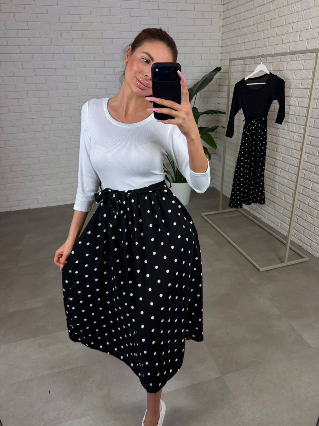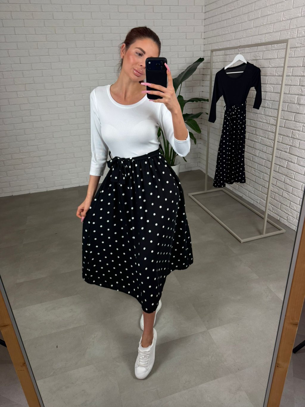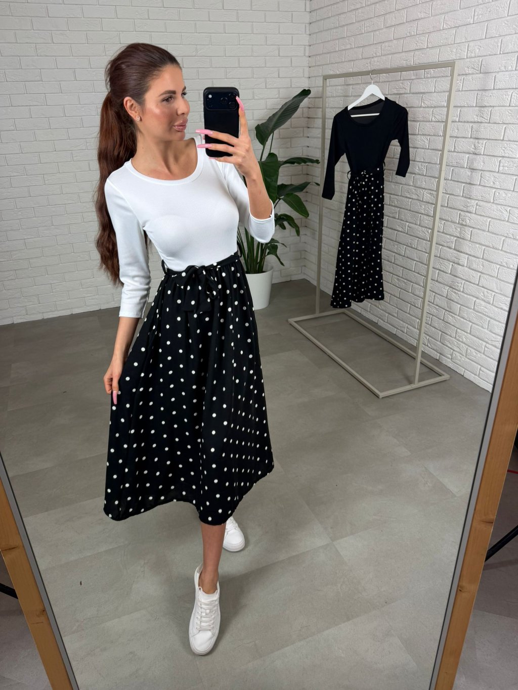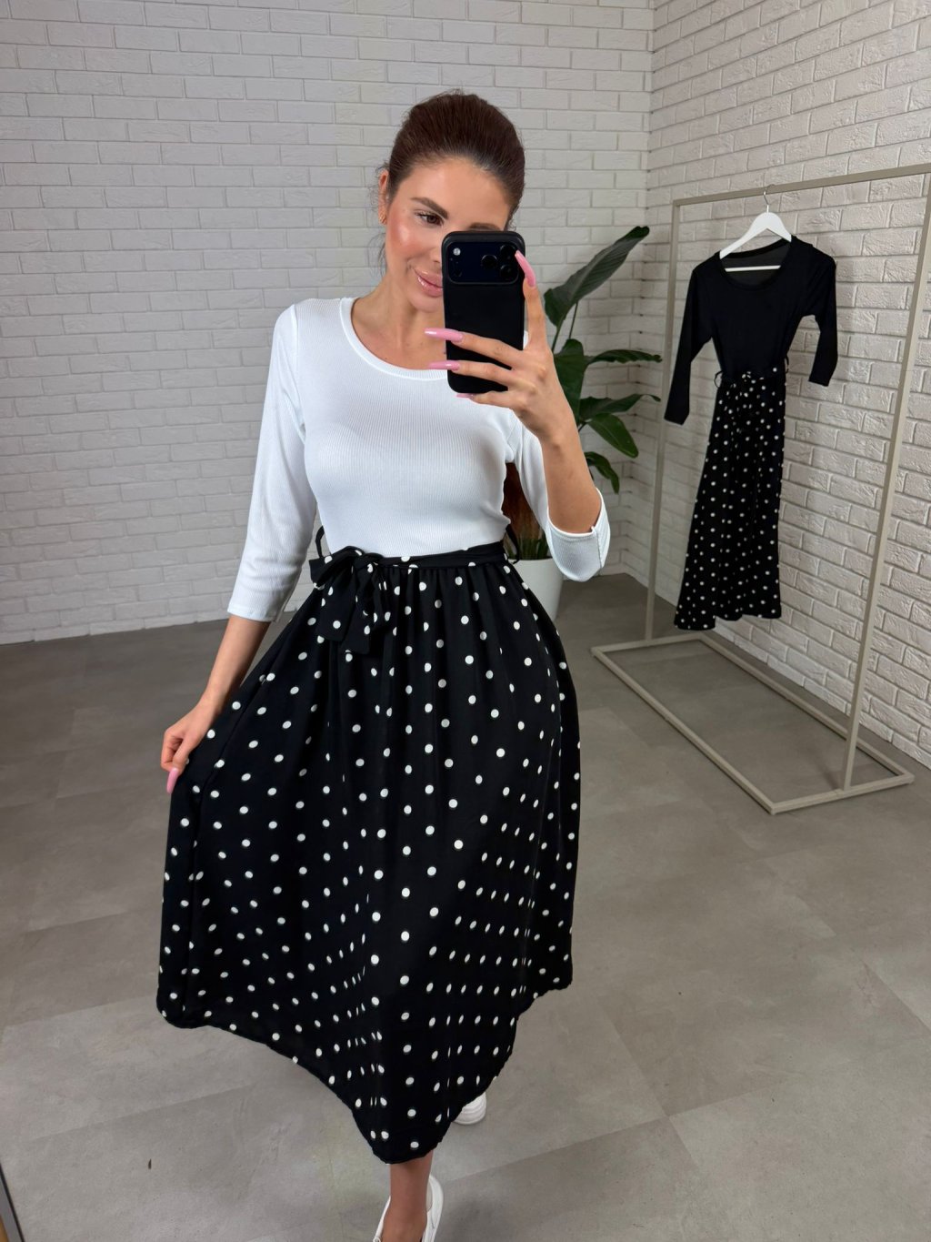 Šaty NORMEN majú ten krásny jemne retro vintage nádych, ktorý pôsobí žensky a upravene, no stále úplne prirodzene. Vrchná časť je z príjemného vrubkovaného materiálu, ktorý sa pekne prispôsobí postave a vďaka 3/4 rukávu sú šaty výborné aj na prechodné obdobie – nie sú ani príliš odhalené, ani ťažké. V páse je elastická guma, takže sa prispôsobí každému brušku a nič netlačí ani počas celého dňa. Opasok si vieš previazať podľa seba – keď chceš zvýrazniť pás a vytvoriť krajšiu líniu, alebo ho môžeš uviazať voľnejšie pre ležérnejší vzhľad. Bodkovaná suknička je vzdušná, príjemne sa hýbe pri chôdzi a midi dĺžka je ako stvorená aj pre vyššie kočky – šaty pôsobia elegantne, vyvážene a veľmi nadčasovo. Veľkostne sedia od S po L a sú ideálne, keď chceš jednoduchý kúsok, ktorý spraví celý outfit bez veľkej námahy.