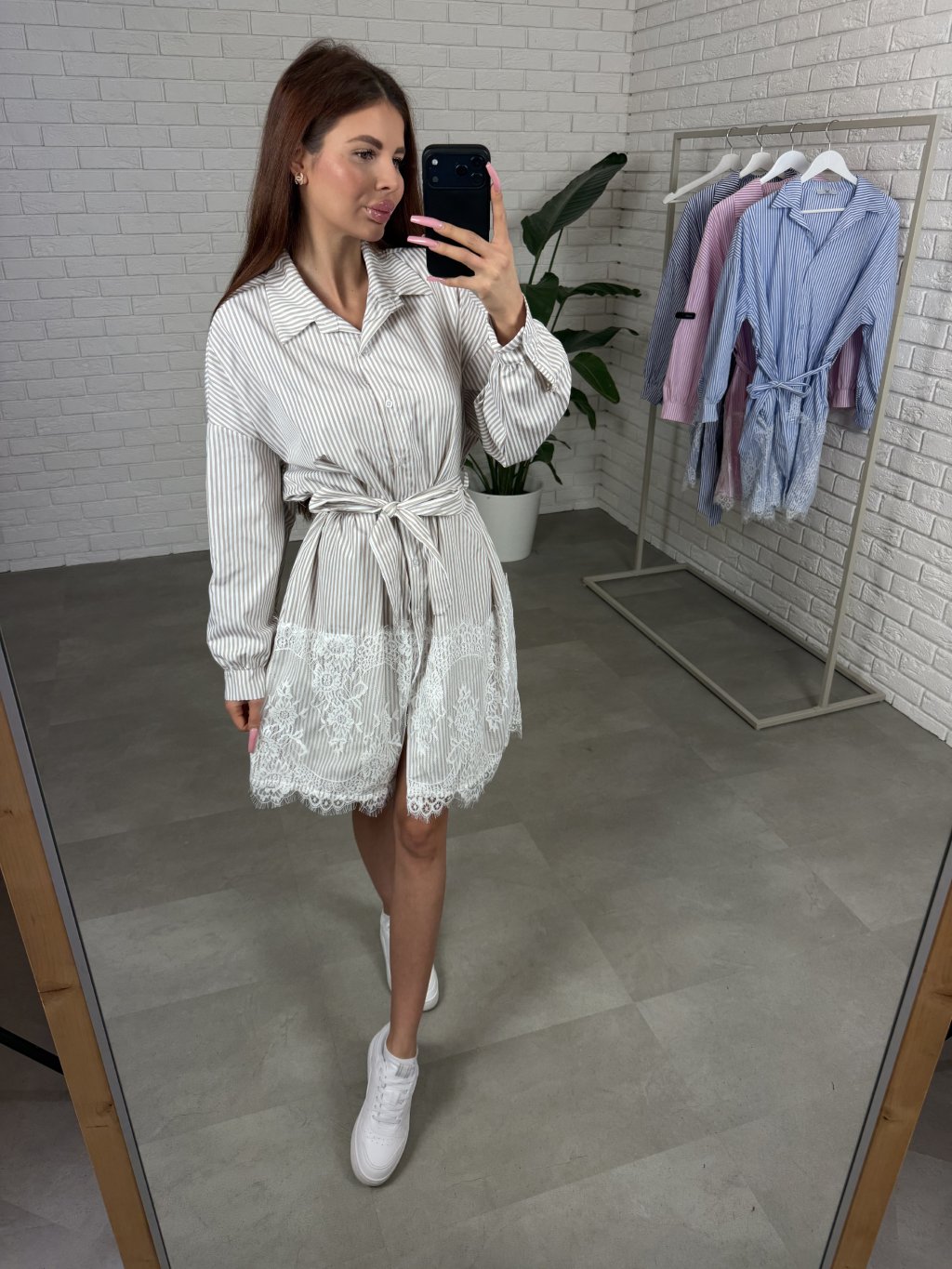 Dominantným detailom je jemná romantická čipka na spodnej časti šiat, ktorá modelu dodáva ženský a elegantný nádych. Zvislé pásiky opticky zoštíhľujú siluetu a opasok v páse krásne zvýrazní ženské krivky. Praktickým detailom sú aj vrecká po bokoch, ktoré oceníš pri každodennom nosení.