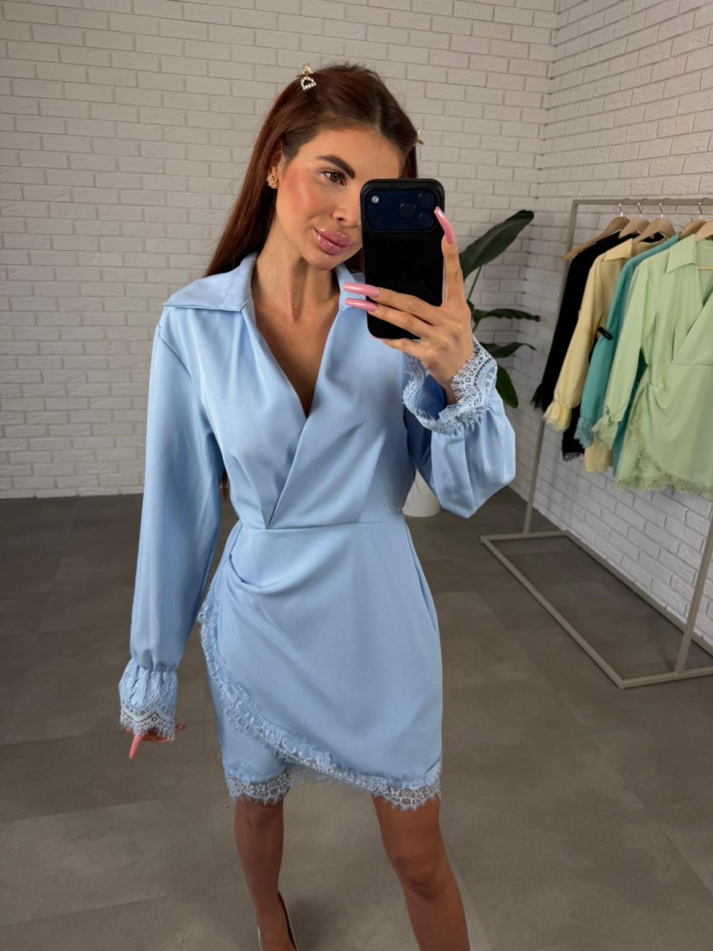 Košeľový golierik spolu s čipkovanými rukávikmi dodáva modelu elegantný „chic“ nádych. Pás je riešený elastickou gumičkou, ktorá sa pekne prispôsobí postave, opticky uhladí siluetu a zároveň zostáva veľmi pohodlná.