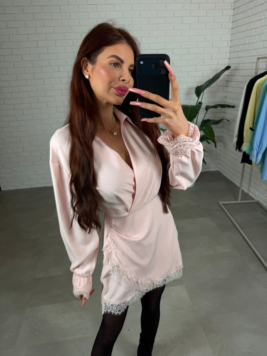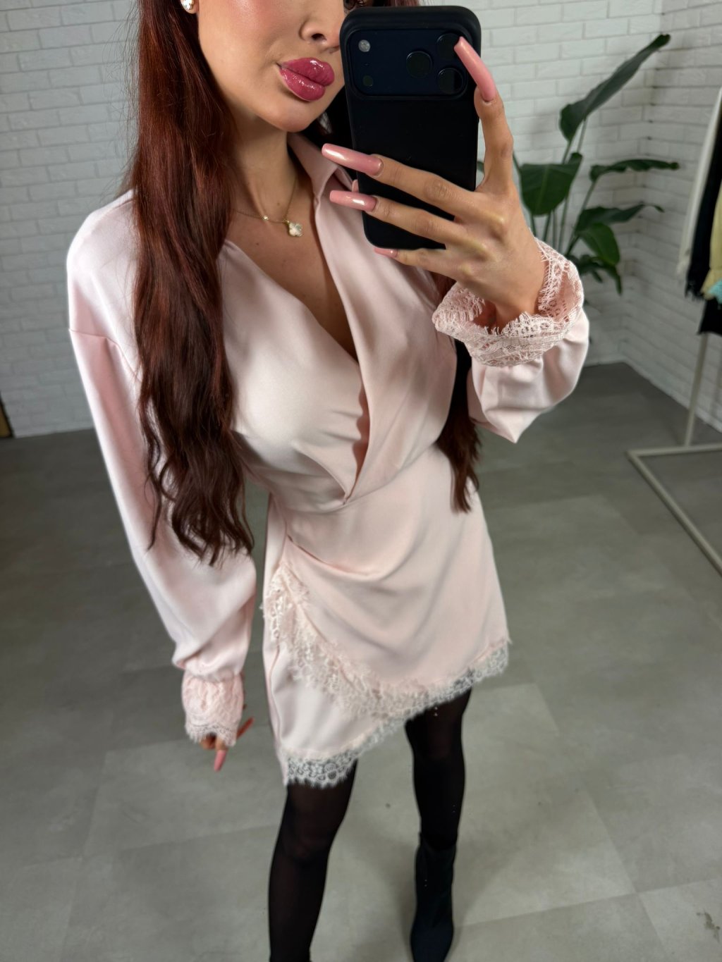 Šaty ORION z luxusného materiálu a v jarných farbách, majú prekladaný výstrih a sukničku, čipkované rukáviky a košelový golierik, pás je maskovaného strihu a má elastickú gumku, vhodné na veľkosti od XS až M.
