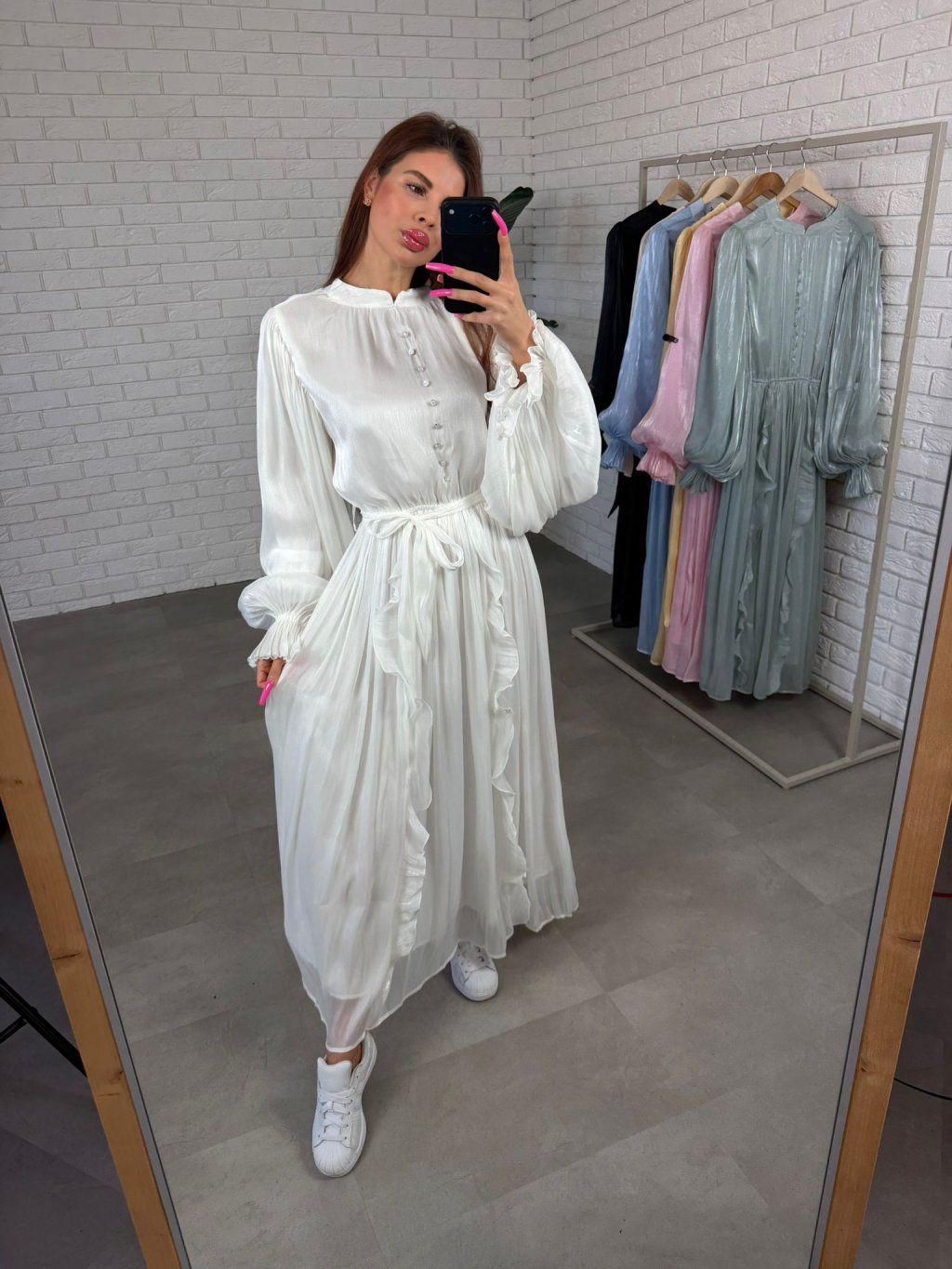 Šaty PLUTO sú výrazný a elegantný kúsok, ktorý pôsobí luxusne a zároveň sa veľmi príjemne nosí. Vrchná časť je doplnená ozdobnými gombíkmi a jemne lesklým materiálom, ktorý krásne vynikne pri pohybe a dodáva šatám výnimočný charakter.Rukávy sú voľné a zakončené elastickou gumičkou, takže sa pohodlne prispôsobia každej ručičke bez pocitu obmedzenia. Bohatá suknička vytvára ženský efekt a vďaka podšívke sa šaty nosia komfortne počas celého dňa.