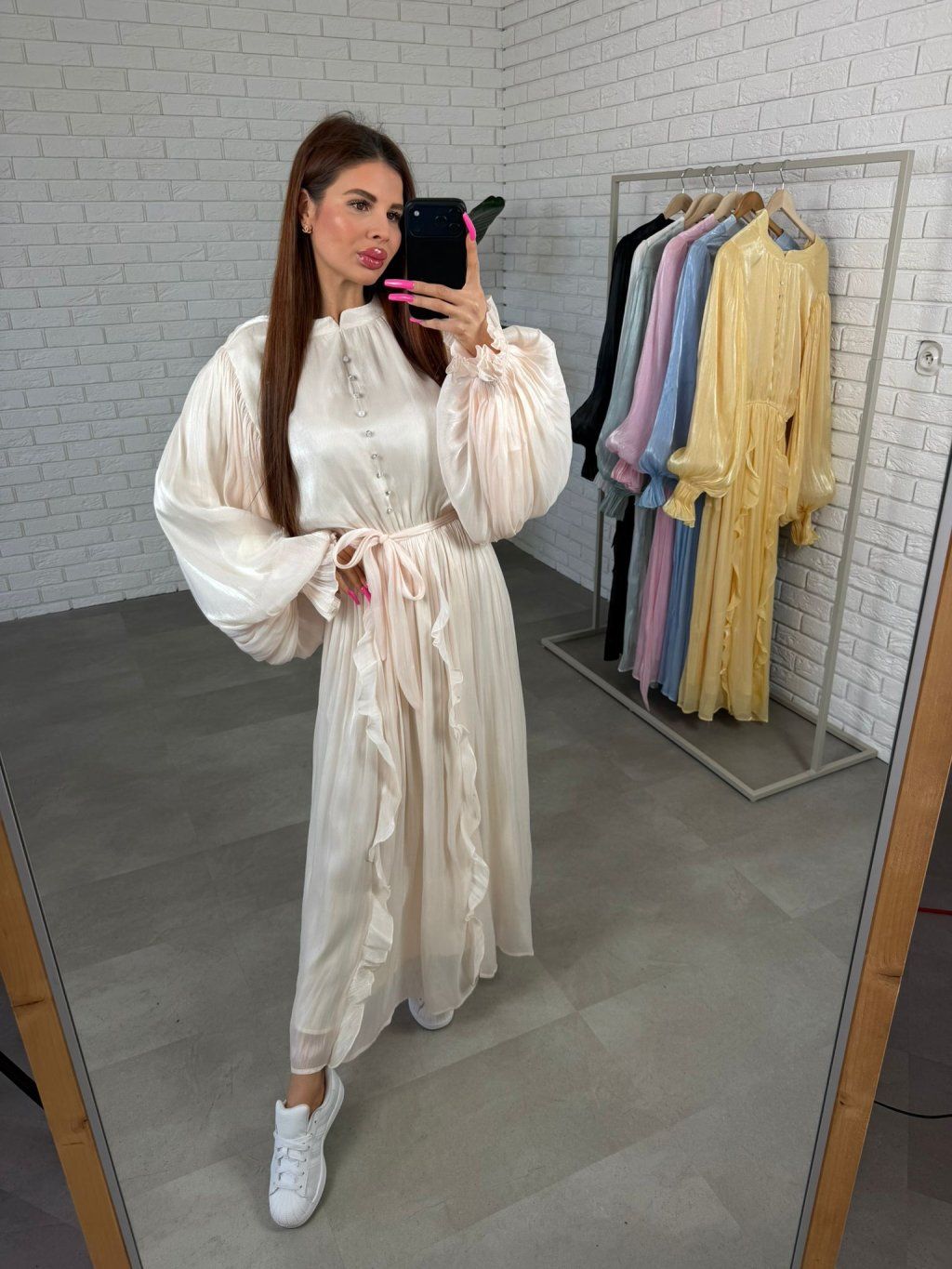 Šaty PLUTO sú výrazný a elegantný kúsok, ktorý pôsobí luxusne a zároveň sa veľmi príjemne nosí. Vrchná časť je doplnená ozdobnými gombíkmi a jemne lesklým materiálom, ktorý krásne vynikne pri pohybe a dodáva šatám výnimočný charakter.Rukávy sú voľné a zakončené elastickou gumičkou, takže sa pohodlne prispôsobia každej ručičke bez pocitu obmedzenia. Bohatá suknička vytvára ženský efekt a vďaka podšívke sa šaty nosia komfortne počas celého dňa.