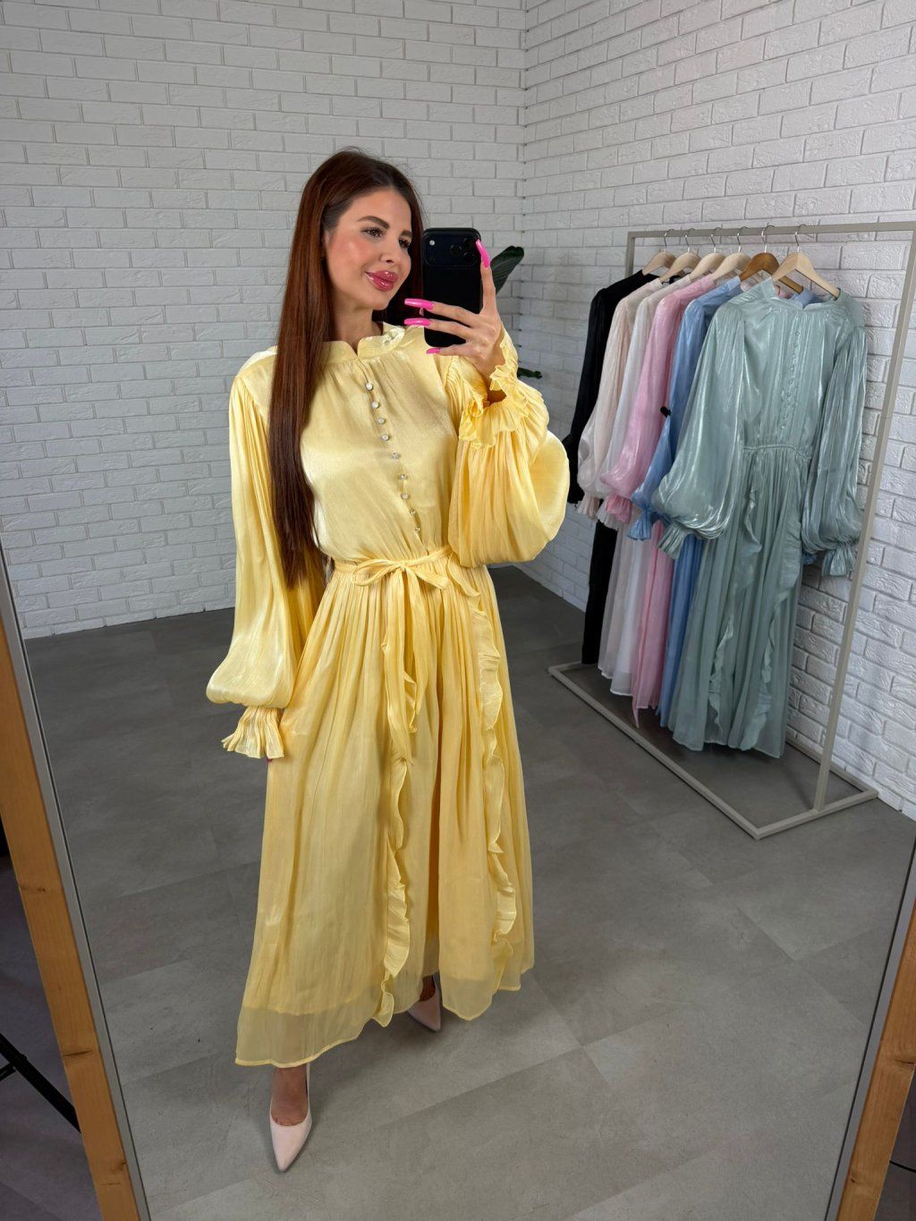 Šaty PLUTO sú výrazný a elegantný kúsok, ktorý pôsobí luxusne a zároveň sa veľmi príjemne nosí. Vrchná časť je doplnená ozdobnými gombíkmi a jemne lesklým materiálom, ktorý krásne vynikne pri pohybe a dodáva šatám výnimočný charakter.