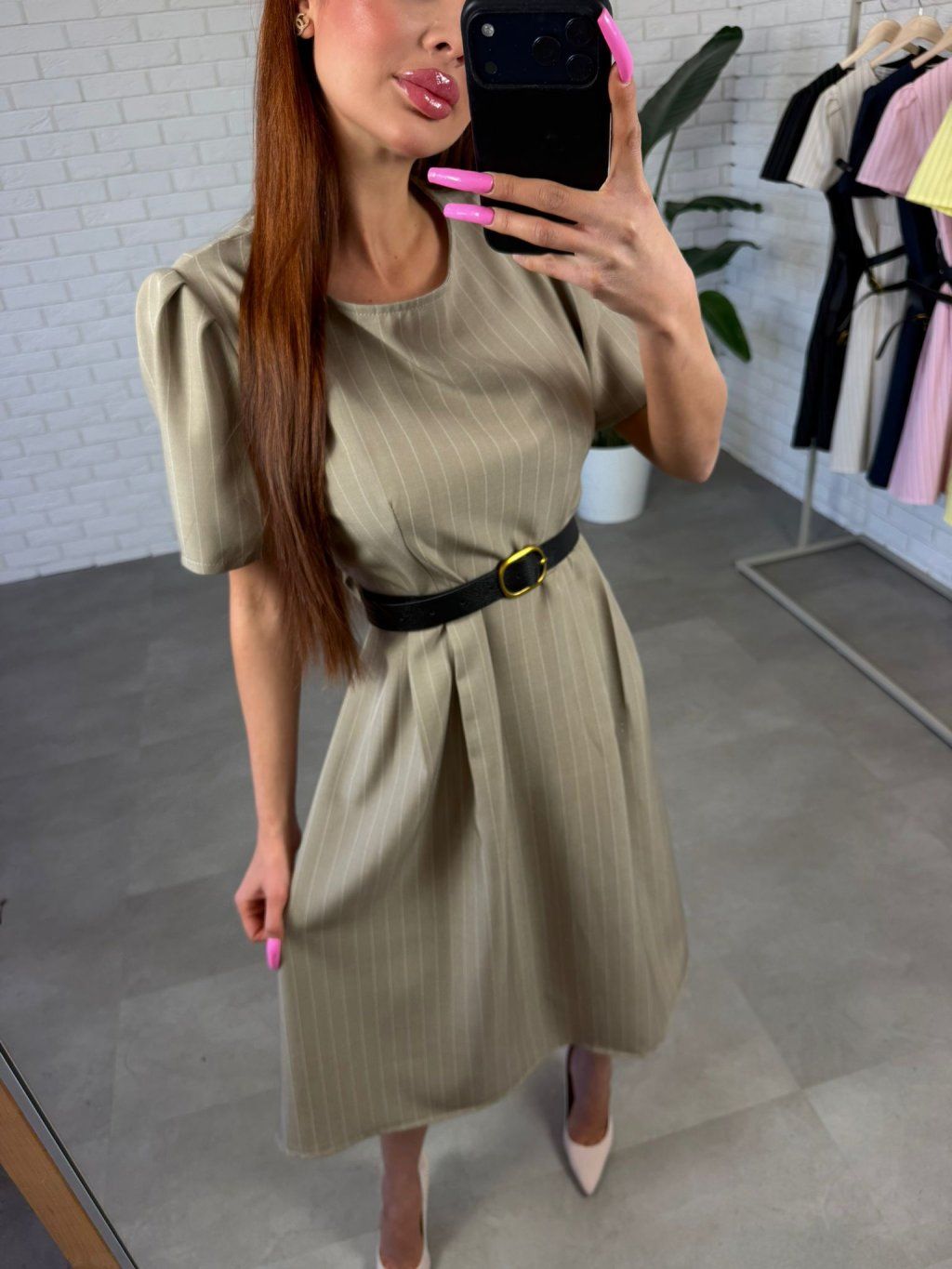 Áčkový strih prirodzene splýva na postave a pomáha vyvážiť siluetu, pričom dĺžka tesne pod kolená pôsobí veľmi elegantne. Krátke rukávy zakrývajú ramená a plecia, čo dodáva šatám upravený charakter vhodný aj do pracovného prostredia.