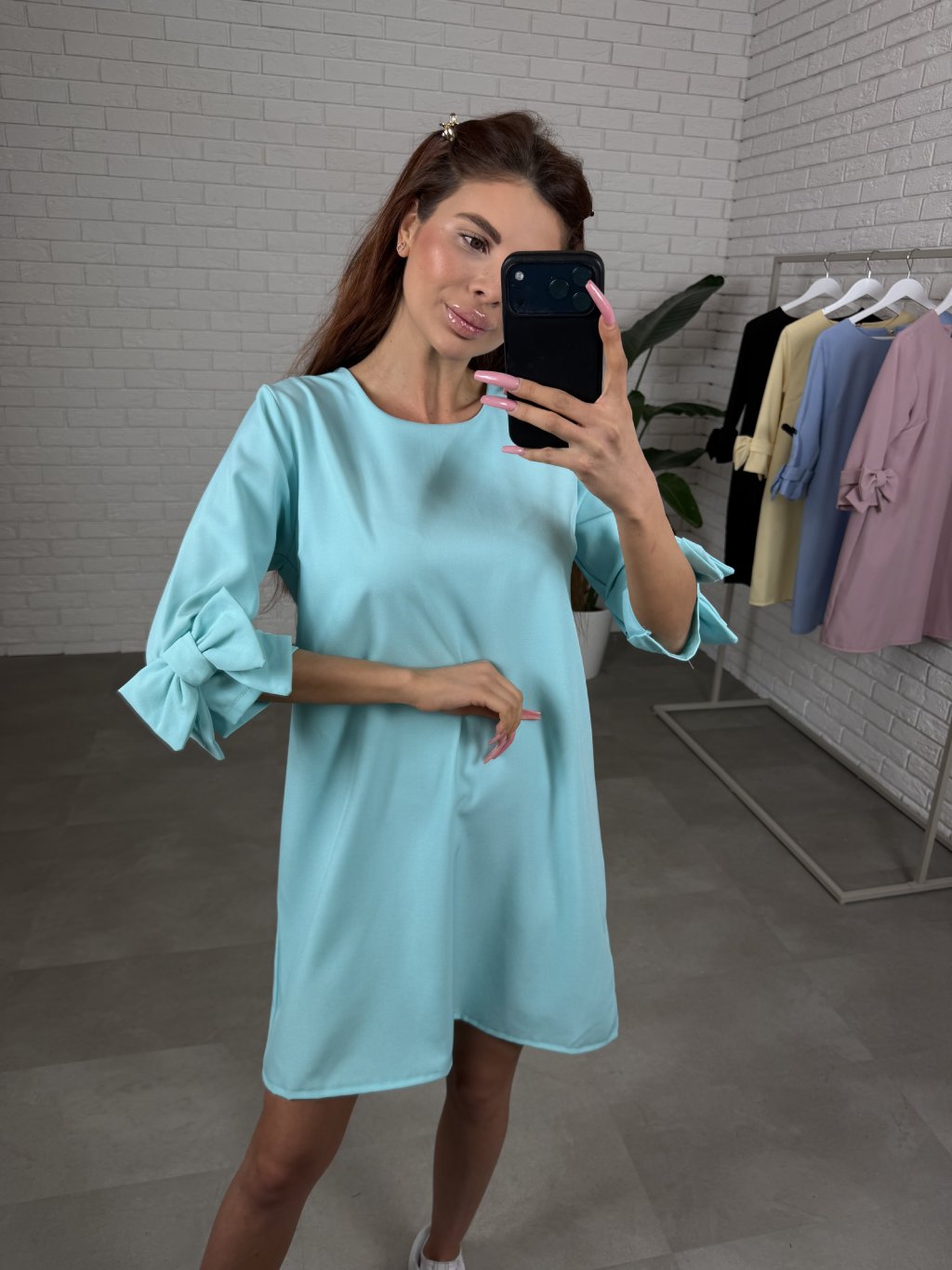 Dominantou modelu sú trojštvrťové rukávy zdobené romantickými ozdobnými mašľami, ktoré dodávajú šatám jemný a ženský charakter. Zadná časť je doplnená zapínaním na gombík, čo uľahčuje obliekanie a zároveň pôsobí elegantne.