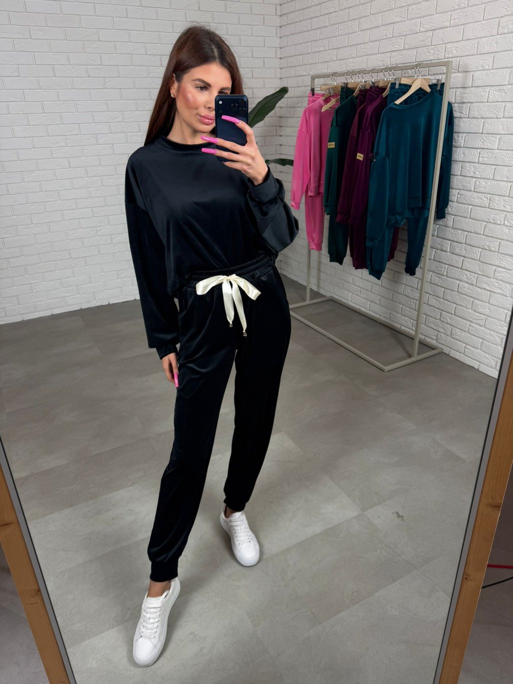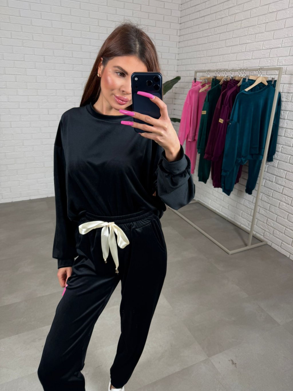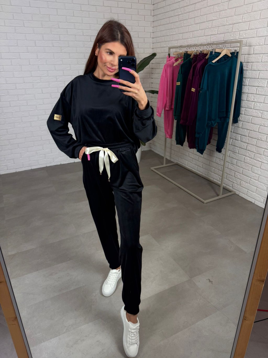Zamatová súprava BENOR s krásnou mašličkou v páse a zlatou nášivkou na rukáve. Gate majú elastický pás, po bokoch vrecká a na spodku sú ukončené patentom Celá súprava je z veľmi príjemného mäkkučkého, nekrčivého materiálu. Súprava má voľný pohodlný strih a sadne od XS po XL.