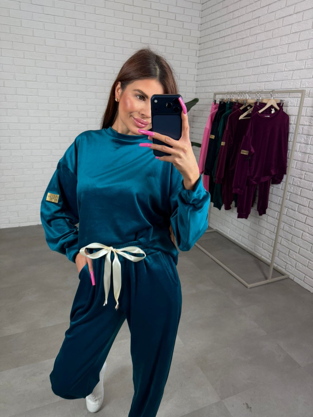 Zamatová súprava BENOR s krásnou mašličkou v páse a zlatou nášivkou na rukáve. Gate majú elastický pás, po bokoch vrecká a na spodku sú ukončené patentom Celá súprava je z veľmi príjemného mäkkučkého, nekrčivého materiálu. Súprava má voľný pohodlný strih a sadne od XS po XL.
