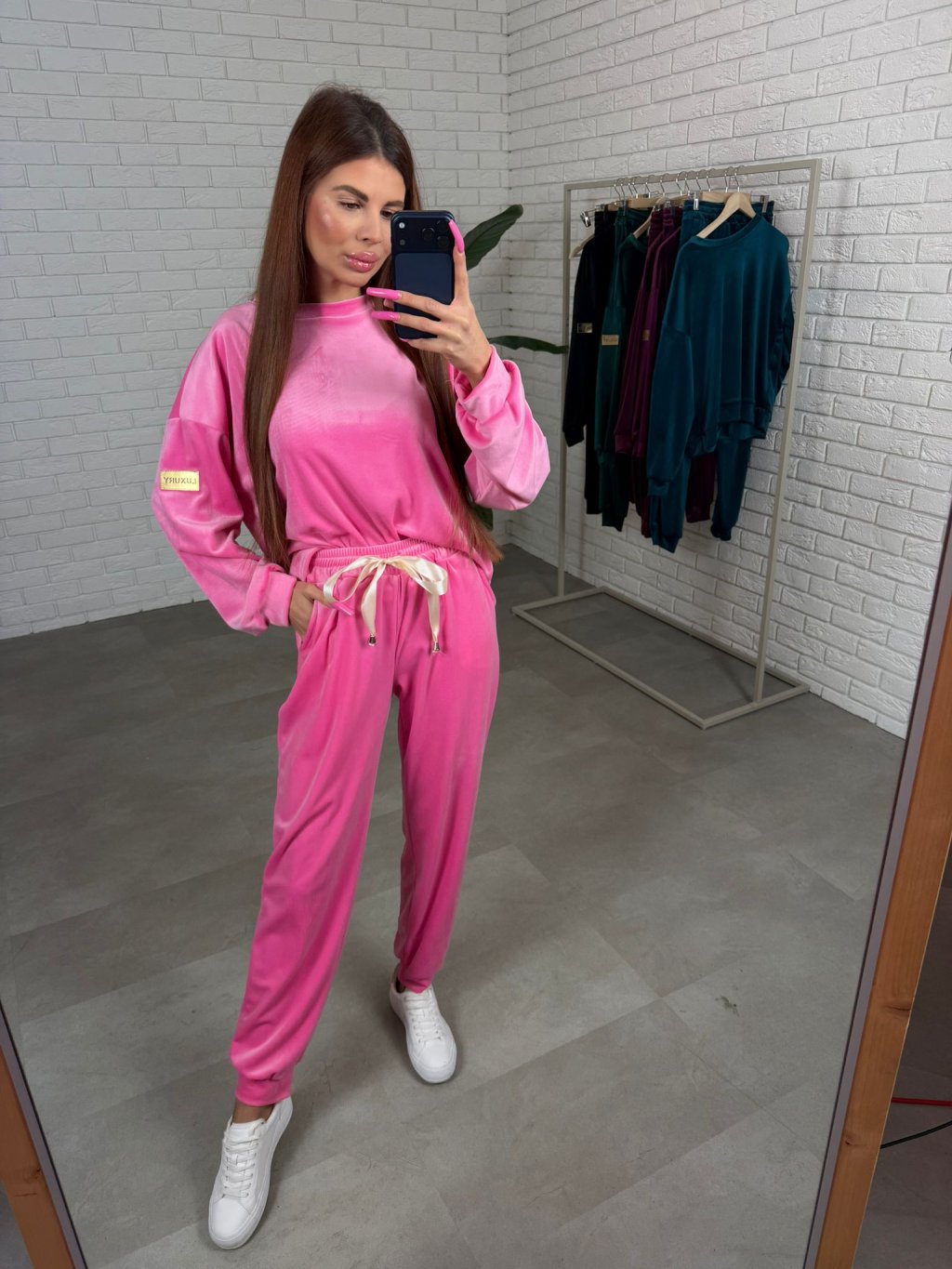 Zamatová súprava BENOR s krásnou mašličkou v páse a zlatou nášivkou na rukáve. Gate majú elastický pás, po bokoch vrecká a na spodku sú ukončené patentom Celá súprava je z veľmi príjemného mäkkučkého, nekrčivého materiálu. Súprava má voľný pohodlný strih a sadne od XS po XL.