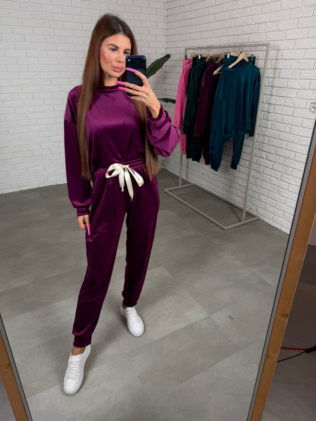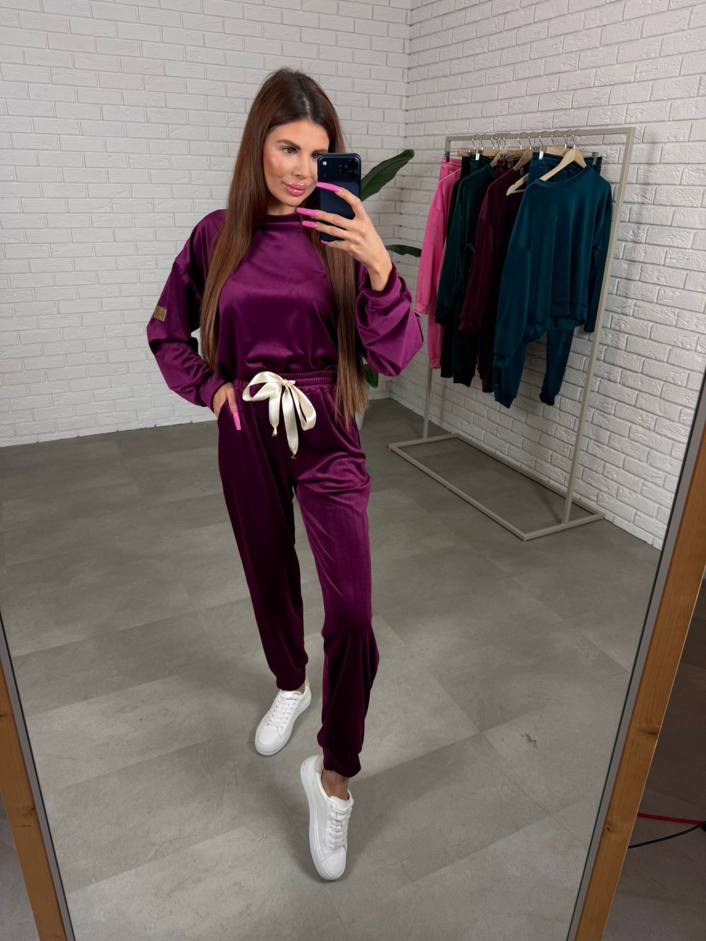 Zamatová súprava BENOR s krásnou mašličkou v páse a zlatou nášivkou na rukáve. Gate majú elastický pás, po bokoch vrecká a na spodku sú ukončené patentom Celá súprava je z veľmi príjemného mäkkučkého, nekrčivého materiálu. Súprava má voľný pohodlný strih a sadne od XS po XL.
