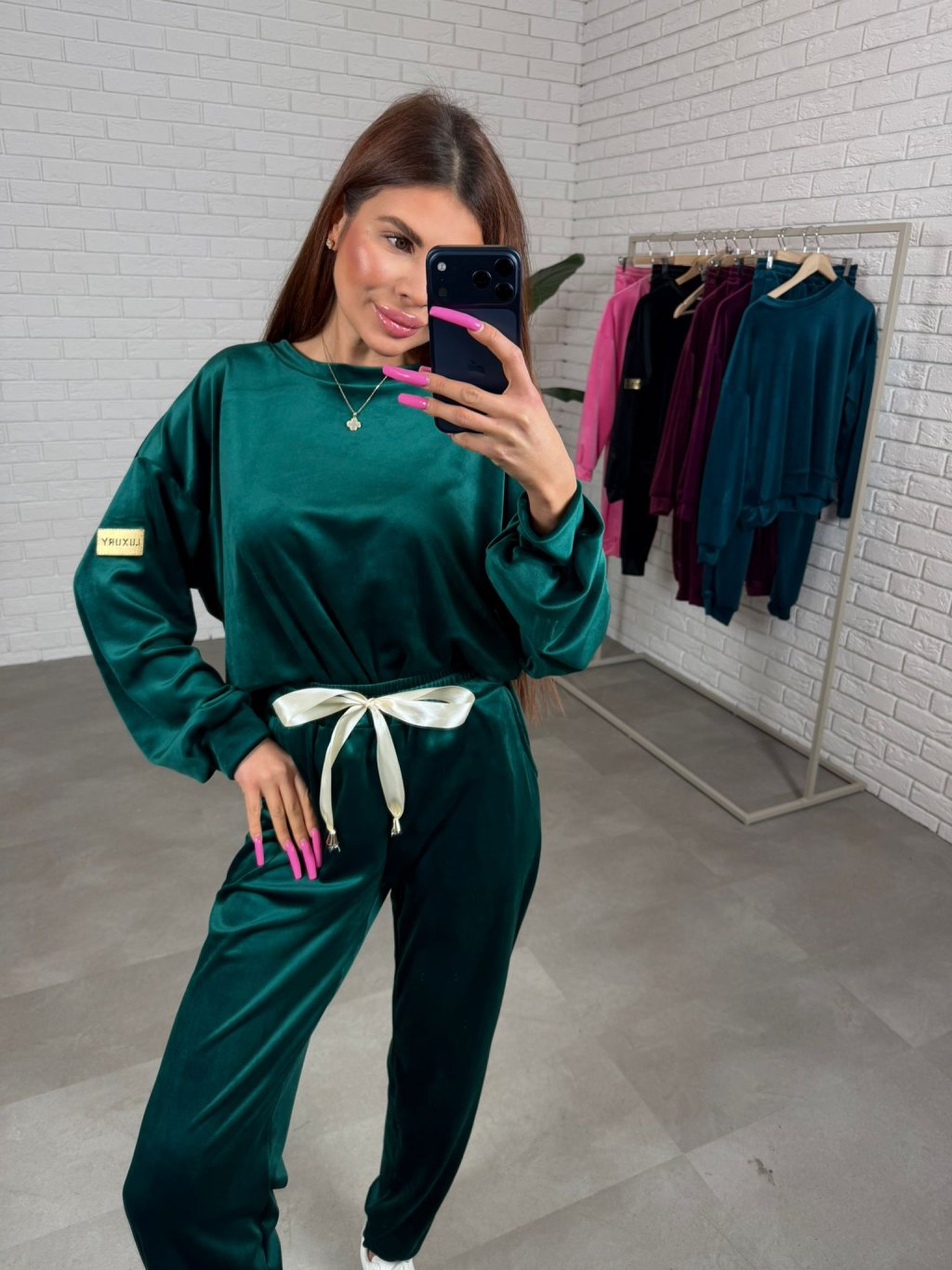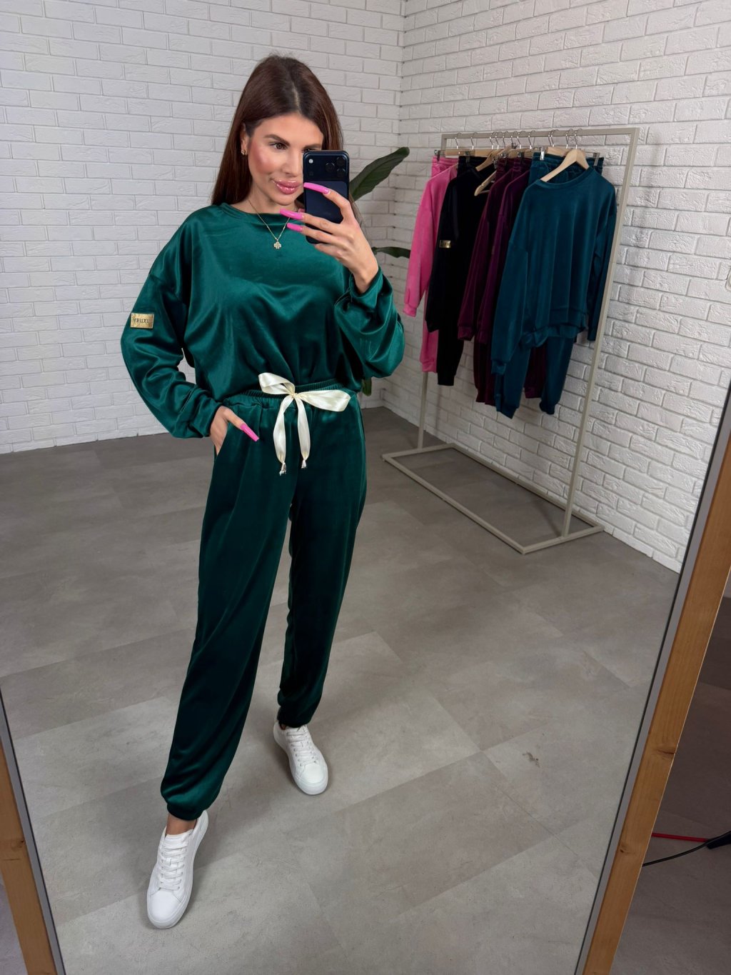 Zamatová súprava BENOR s krásnou mašličkou v páse a zlatou nášivkou na rukáve. Gate majú elastický pás, po bokoch vrecká a na spodku sú ukončené patentom Celá súprava je z veľmi príjemného mäkkučkého, nekrčivého materiálu. Súprava má voľný pohodlný strih a sadne od XS po XL.
