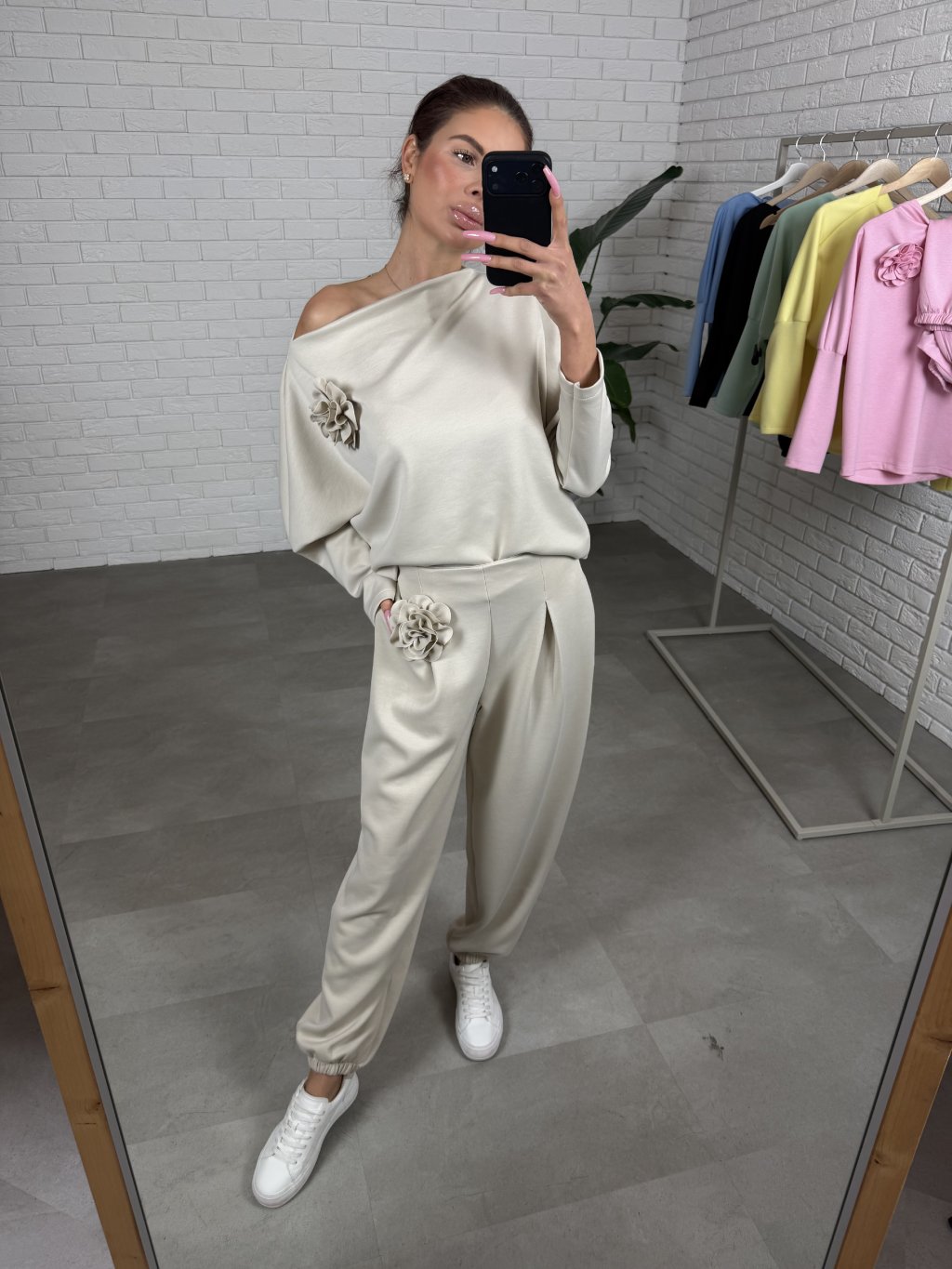 Súprava ROSE je moderný a pohodlný kúsok s voľným ležérnym strihom, ktorý si zamiluješ na každý deň. Príjemný materiál krásne splýva a poskytuje komfort počas celého dňa. Nohavice majú extra elastickú gumičku v páse, ktorá netlačí, a praktické hlboké vrecká. Mikinka je voľná, má dostatočne dlhé rukávy a môžeš ju nosiť aj jemne spustenú na jedno plece. Súčasťou sú dva odopínateľné kvietky, vďaka ktorým si outfit upravíš podľa nálady. Súprava je vhodná aj pre vyššie postavy do 185 cm a veľkostne sadne od M po XXL.