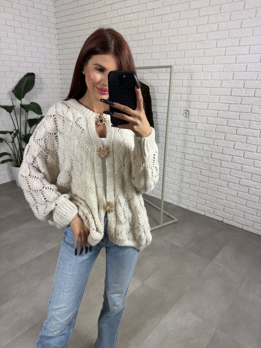 Sveter s brošnami Jana v príjemnom mäkkom materiáli. Je v predĺženom strihu. Na mieste gombíkov sú brošne v tvare slnka, ktoré sa dajú zo svetríka odopnúť, takže sa dá nosiť na viac spôsobov. Sadne na konfekčné veľkosti od XS po XL aj na vyššie postavy. Na svetríku sú jemné vzory. Vhodný na jeseň aj na leto.
