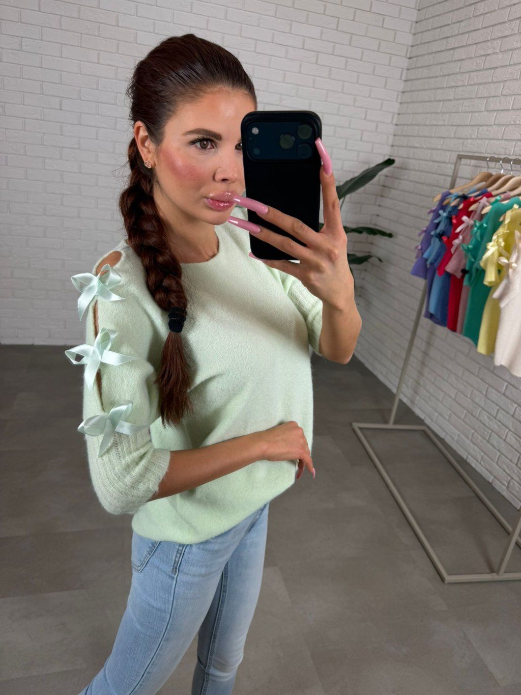 Dominantným prvkom sú tri saténové mašle na rukávoch, ktoré dodávajú svetríku romantický a elegantný charakter. Elastické rukávy sa pohodlne prispôsobia a držia tvar, pričom vytvárajú jemný a upravený vzhľad. Svetrík sa jednoducho kombinuje s nohavicami, sukňou aj rifľami a je ideálny na bežné dni aj elegantnejšie príležitosti. Vďaka vysokej elasticite materiálu sadne na konfekčné veľkosti od XS po XL.