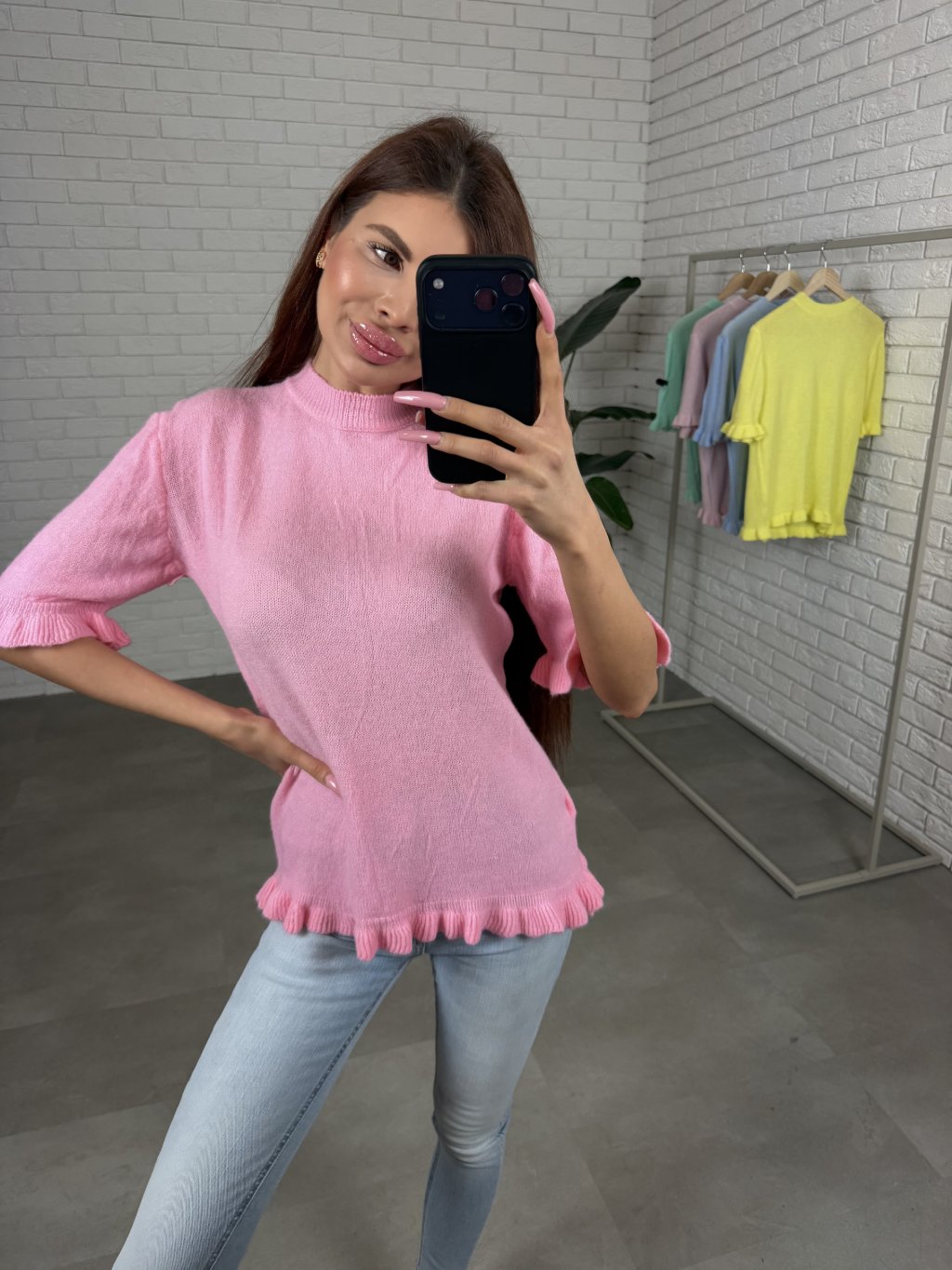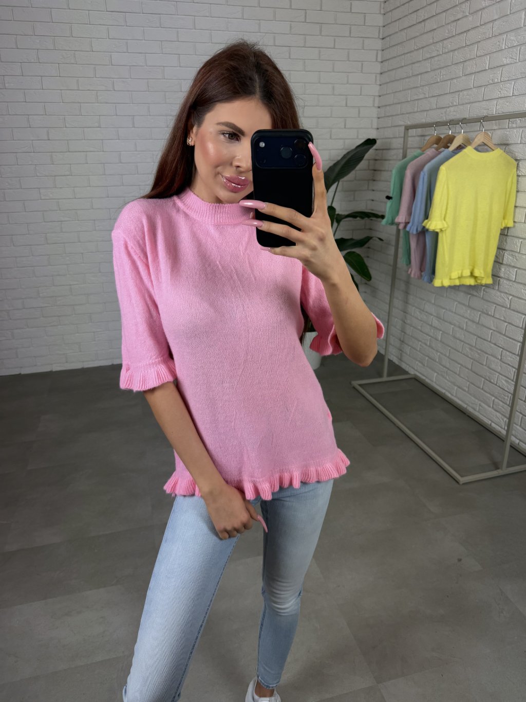 Dominantným detailom sú rozkošné volániky na spodnej časti svetríka a na rukávoch, ktoré dodávajú modelu romantický a hravý nádych. Rukávy majú dĺžku po lakte, vďaka čomu svetrík pôsobí ľahko a veľmi žensky.