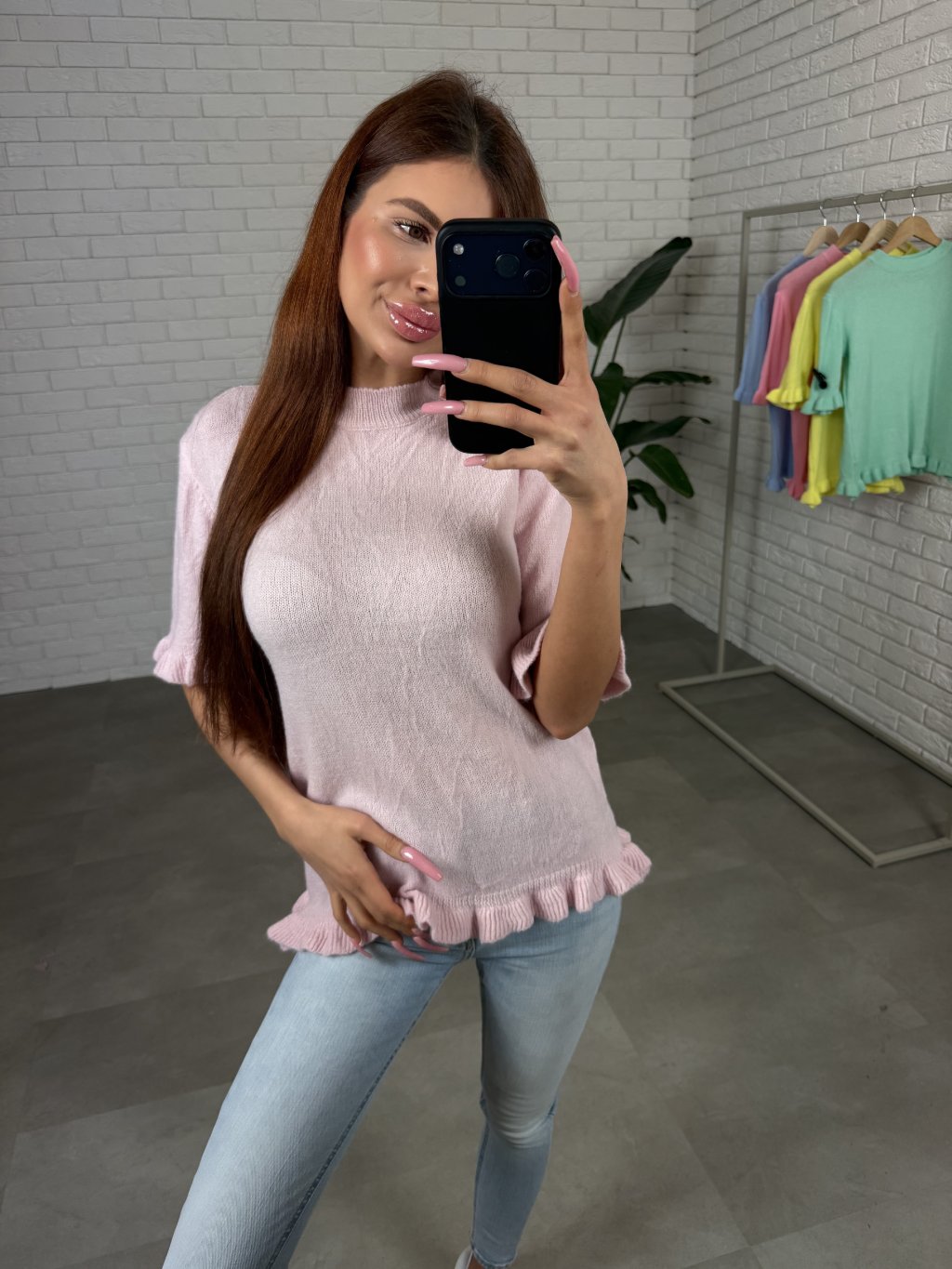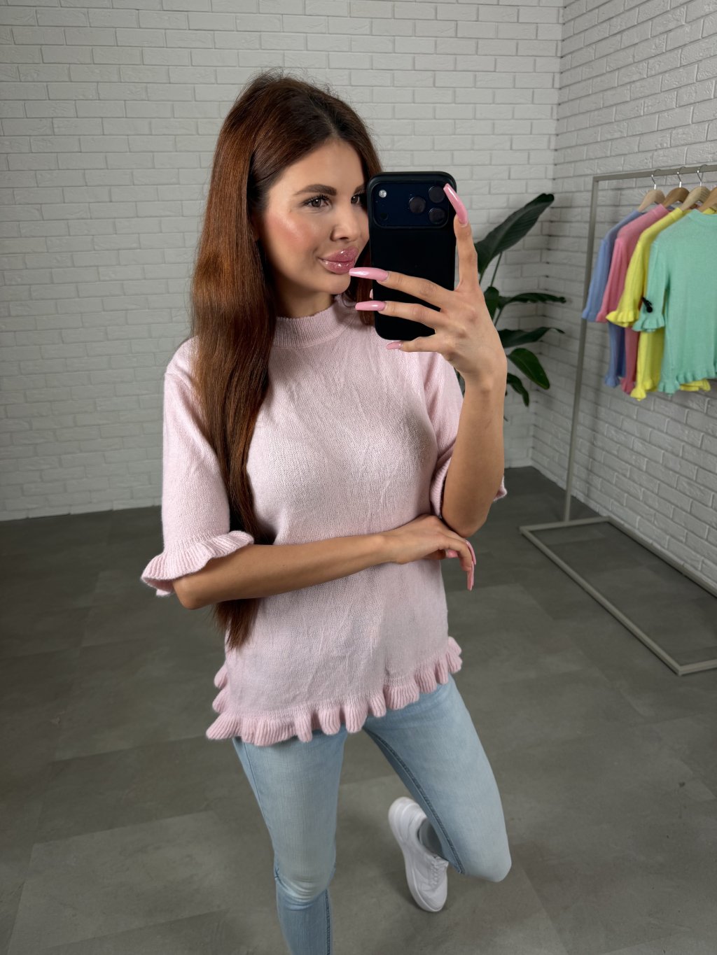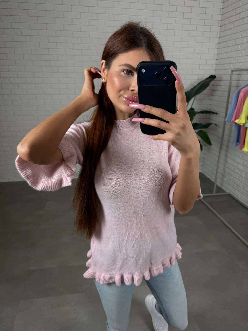 Dominantným detailom sú rozkošné volániky na spodnej časti svetríka a na rukávoch, ktoré dodávajú modelu romantický a hravý nádych. Rukávy majú dĺžku po lakte, vďaka čomu svetrík pôsobí ľahko a veľmi žensky.