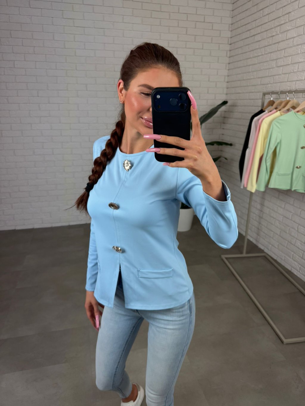 TORA je elegantný top s dlhým rukávom, ktorý je ideálnou voľbou pre ženy, ktoré pracujú v kancelárii alebo ich práca vyžaduje formálnejší štýl obliekania. Je jednoduchý, čistý a veľmi ľahko kombinovateľný. Vyrobený je z kvalitného hladkého materiálu, ktorý je pevný, odolný a naozaj „nezničiteľný“. Nežmolkuje sa, nesperie sa a farby si dlhodobo zachovajú svoju intenzitu aj tvar. Materiál je príjemný, elastický a krásne splýva s telom, čím vytvára elegantnú siluetu. Aby top nepôsobil príliš jednoducho, dopĺňajú ho tri zlaté mušličkové ozdoby, ktoré mu dodávajú jemný, sofistikovaný detail. Rukávy sú dlhé, s krátkym rozparkom na konci, ktorý pôsobí veľmi vkusne. Predná časť je doplnená o jemné „falošné“ vrecká, ktoré dotvárajú celkový elegantný vzhľad. Strih je mierne užší, preto ho odporúčame pre veľkosti XS až M.