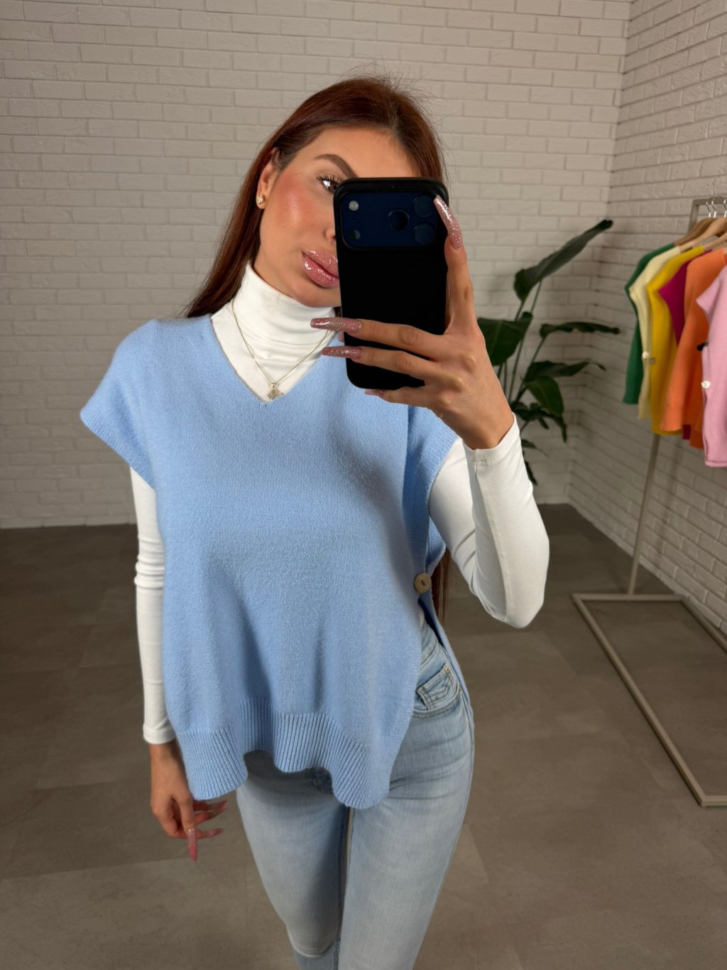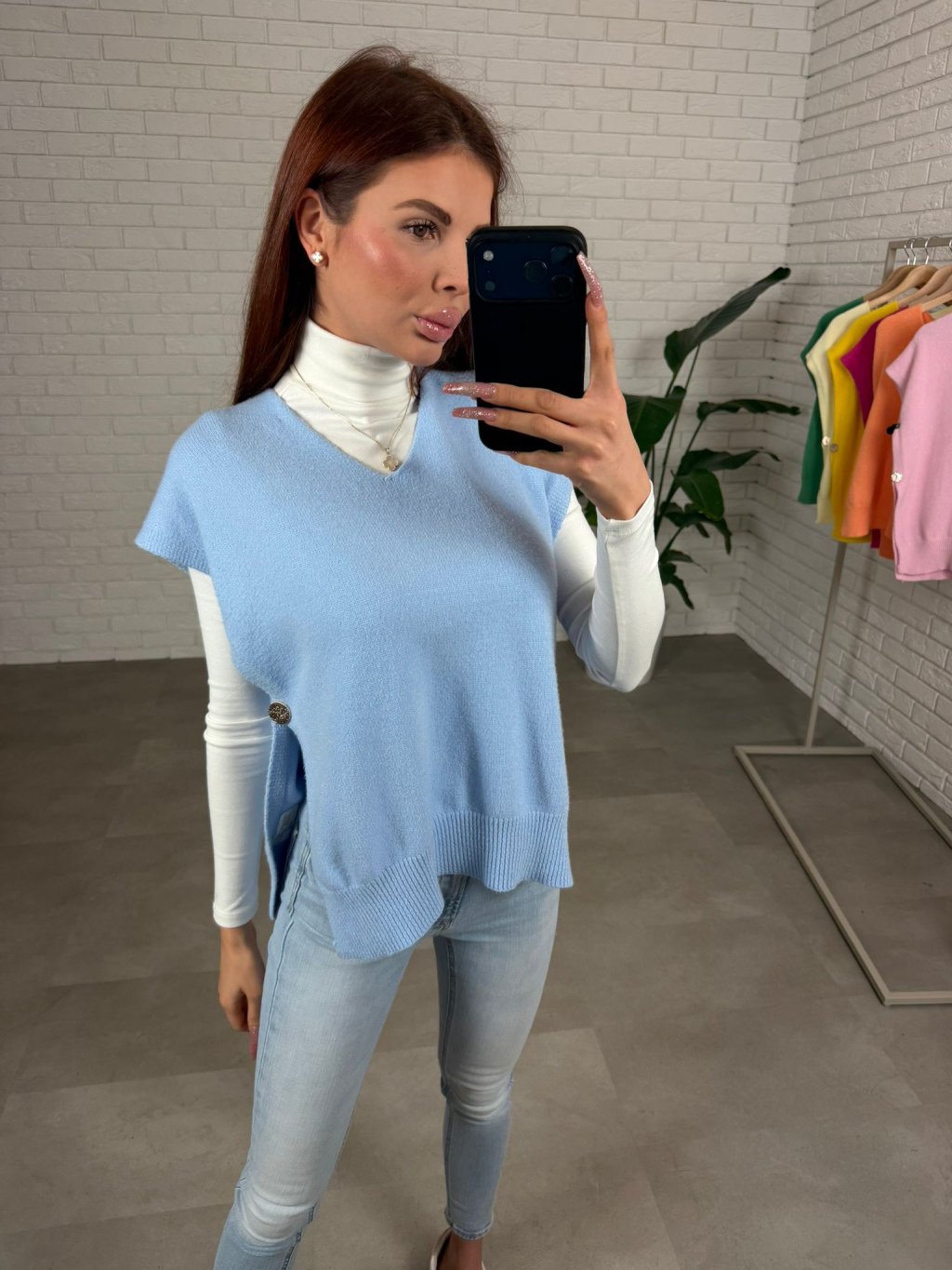 Úpletová vesta PALLA je ušitá z jemného a mäkkého materiálu, ktorý je veľmi príjemný na dotyk a pohodlný počas celého dňa. Úplet pôsobí ľahko, no zároveň si drží tvar a vytvára upravený, elegantný vzhľad bez zbytočného objemu. Voľnejší strih krásne splýva na postave, neobopína problémové partie a prirodzene zakryje oblasť bruška. Vďaka výstrihu do V pôsobí ženským a lichotivým dojmom, opticky predlžuje krk a krásne sa kombinuje s rolákom, košeľou aj jednoduchým tričkom. Kratší rukáv dodáva veste moderný nádych a robí z nej ideálny kúsok na vrstvenie počas chladnejších dní. Bočný detail s gombíkom je nenápadným, no štýlovým prvkom, ktorý vestu odlišuje a dodáva jej originalitu. Úpletová vesta PALLA je skvelou voľbou k džínsom, elegantným nohaviciam aj sukni, jednoducho ju zladíš do ležérneho aj uhladenejšieho outfitu. Sedí na konfekčné veľkosti XS až XL a vďaka svojmu univerzálnemu strihu sa prispôsobí rôznym typom postavy.