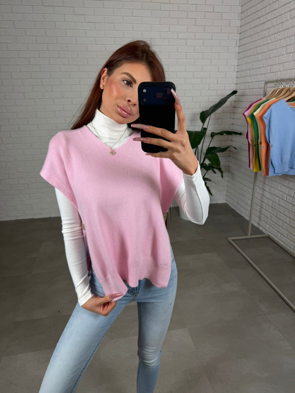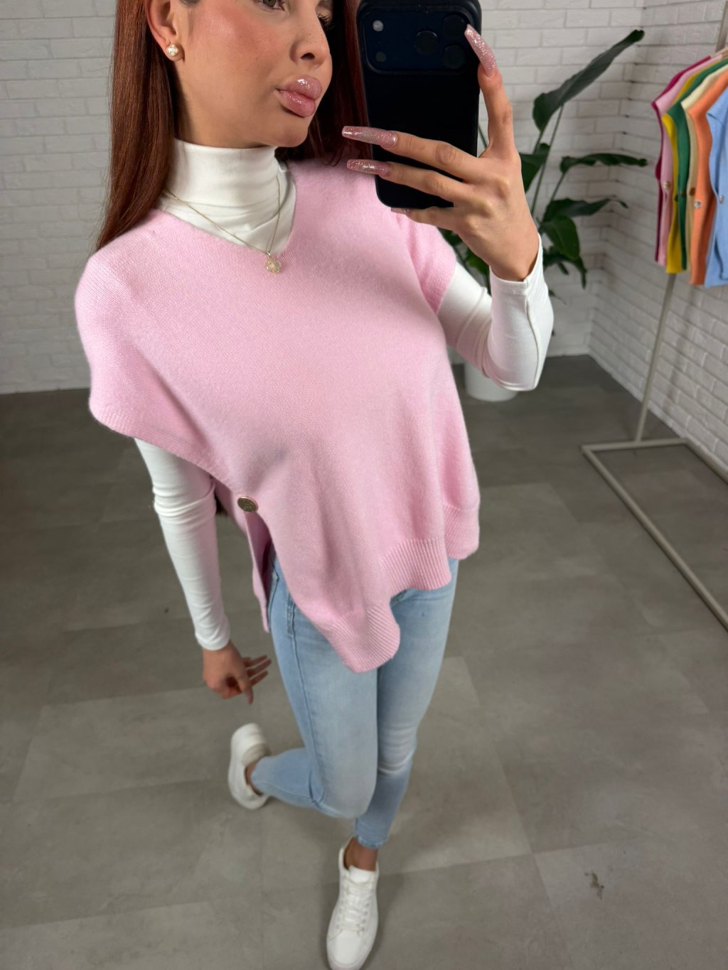 Úpletová vesta PALLA je ušitá z jemného a mäkkého materiálu, ktorý je veľmi príjemný na dotyk a pohodlný počas celého dňa. Úplet pôsobí ľahko, no zároveň si drží tvar a vytvára upravený, elegantný vzhľad bez zbytočného objemu. Voľnejší strih krásne splýva na postave, neobopína problémové partie a prirodzene zakryje oblasť bruška. Vďaka výstrihu do V pôsobí ženským a lichotivým dojmom, opticky predlžuje krk a krásne sa kombinuje s rolákom, košeľou aj jednoduchým tričkom. Kratší rukáv dodáva veste moderný nádych a robí z nej ideálny kúsok na vrstvenie počas chladnejších dní. Bočný detail s gombíkom je nenápadným, no štýlovým prvkom, ktorý vestu odlišuje a dodáva jej originalitu. Úpletová vesta PALLA je skvelou voľbou k džínsom, elegantným nohaviciam aj sukni, jednoducho ju zladíš do ležérneho aj uhladenejšieho outfitu. Sedí na konfekčné veľkosti XS až XL a vďaka svojmu univerzálnemu strihu sa prispôsobí rôznym typom postavy.